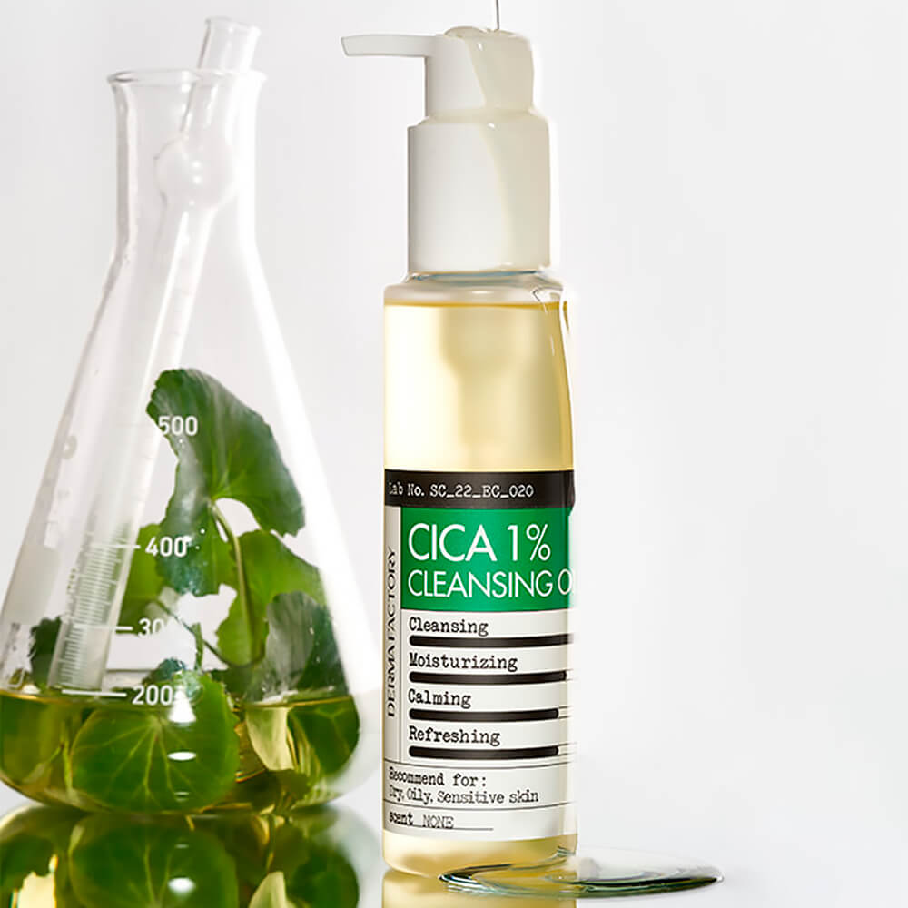 Успокаивающее гидрофильное масло с 1% центеллы Derma Factory Cica 1% Cleansing Oil растворяет загрязнения в порах, удаляет макияж, снимает раздражение и оставляет приятное ощущение свежести и комфорта после умывания. Средство очищает даже от водостойкого и высокопигментированного макияжа, не оставляя следов. Осветляет сальные нити и чёрные точки. Формула основана на 88,8% соевого масла, содержит 1% масла центеллы азиатской и 0,2% масла чайного дерева.