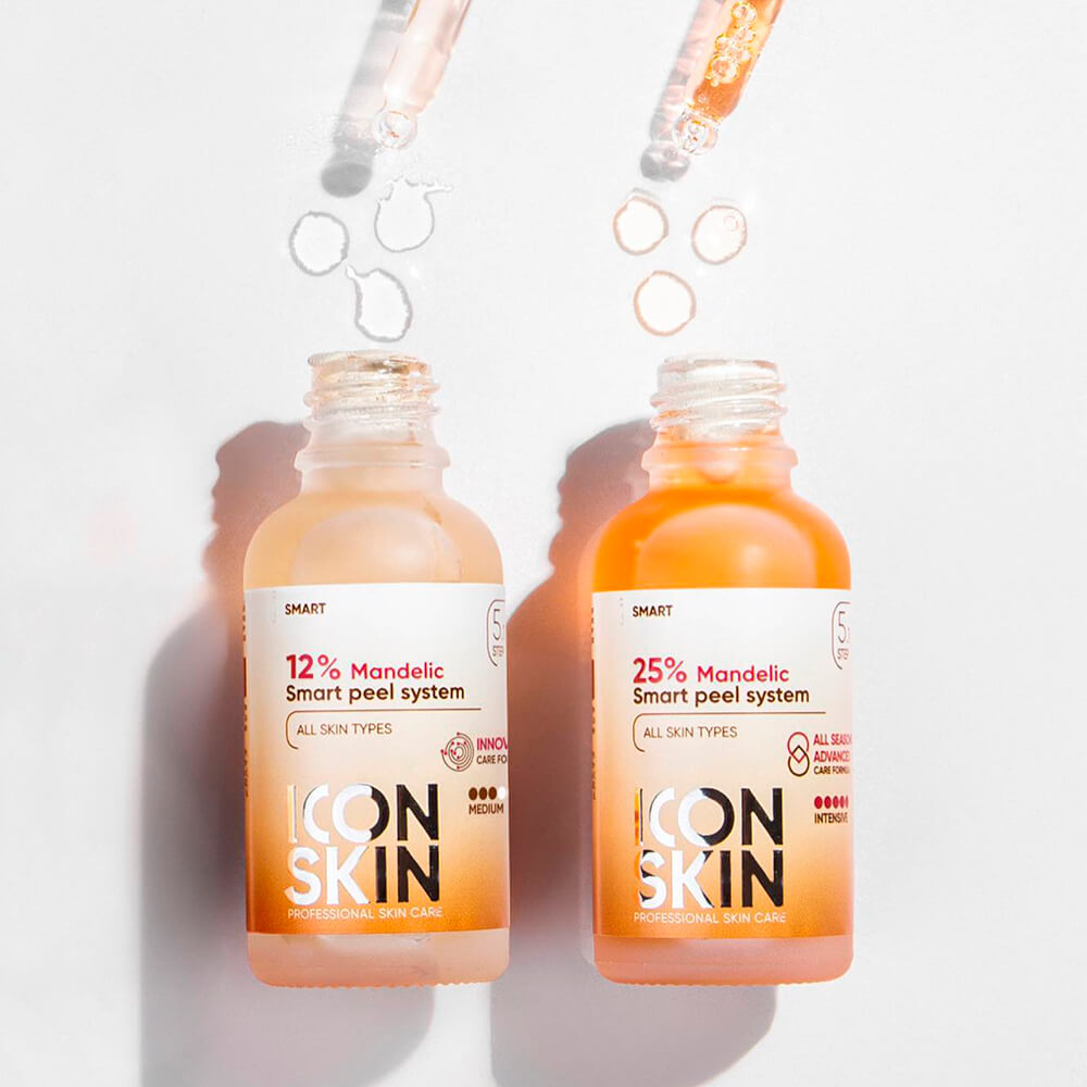 Всесезонный пилинг с 25% миндальной кислоты ICON SKIN 25 % Mandelic Smart Peel System обновляет кожу, разглаживает рельеф, выравнивает тон и придаёт естественное сияние. Средство содержит одну из самых мягких AHA-кислот — миндальную, за счёт чего оказывает деликатное отшелушивающее действие, запуская обновление клеток, и не травмирует роговой слой. Продукт также содержит пантенол, гель листьев алоэ вера, экстракт центеллы, пудру смолы драконового дерева, аллантоин и инулин.