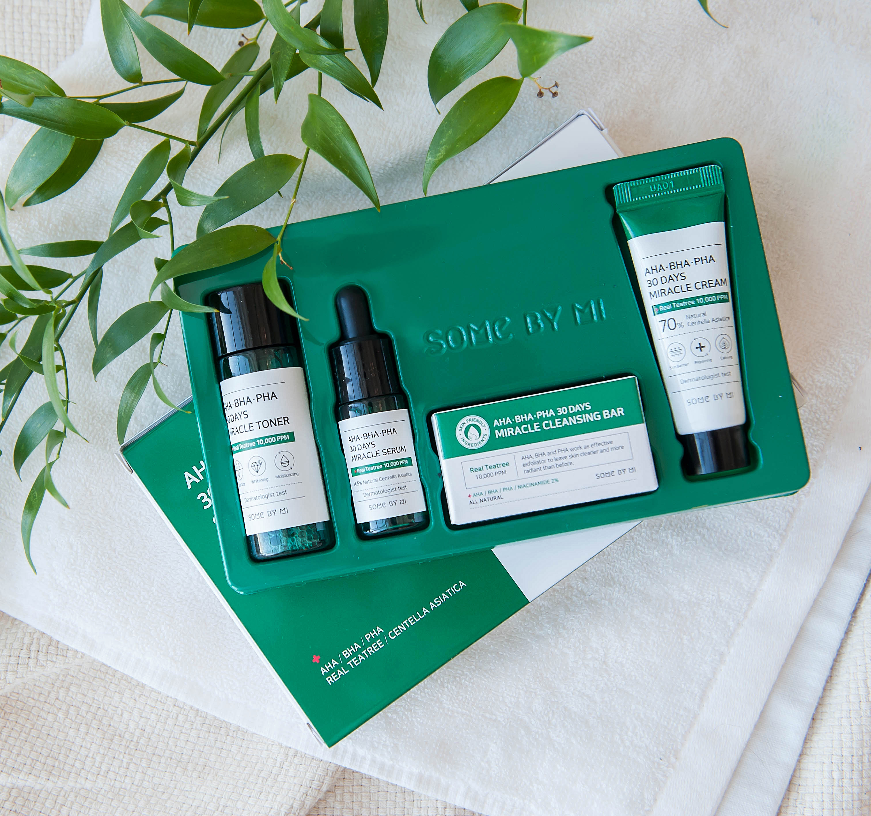 Набор миниатюр от бренда Some By Mi AHA-BHA-PHA 30 Days Miracle Starter Edition, состоящий из 4 мини-версий популярных продуктов на основе 3-х видов кислот из линейки AHA-BHA-PHA 30 Days Miracle.