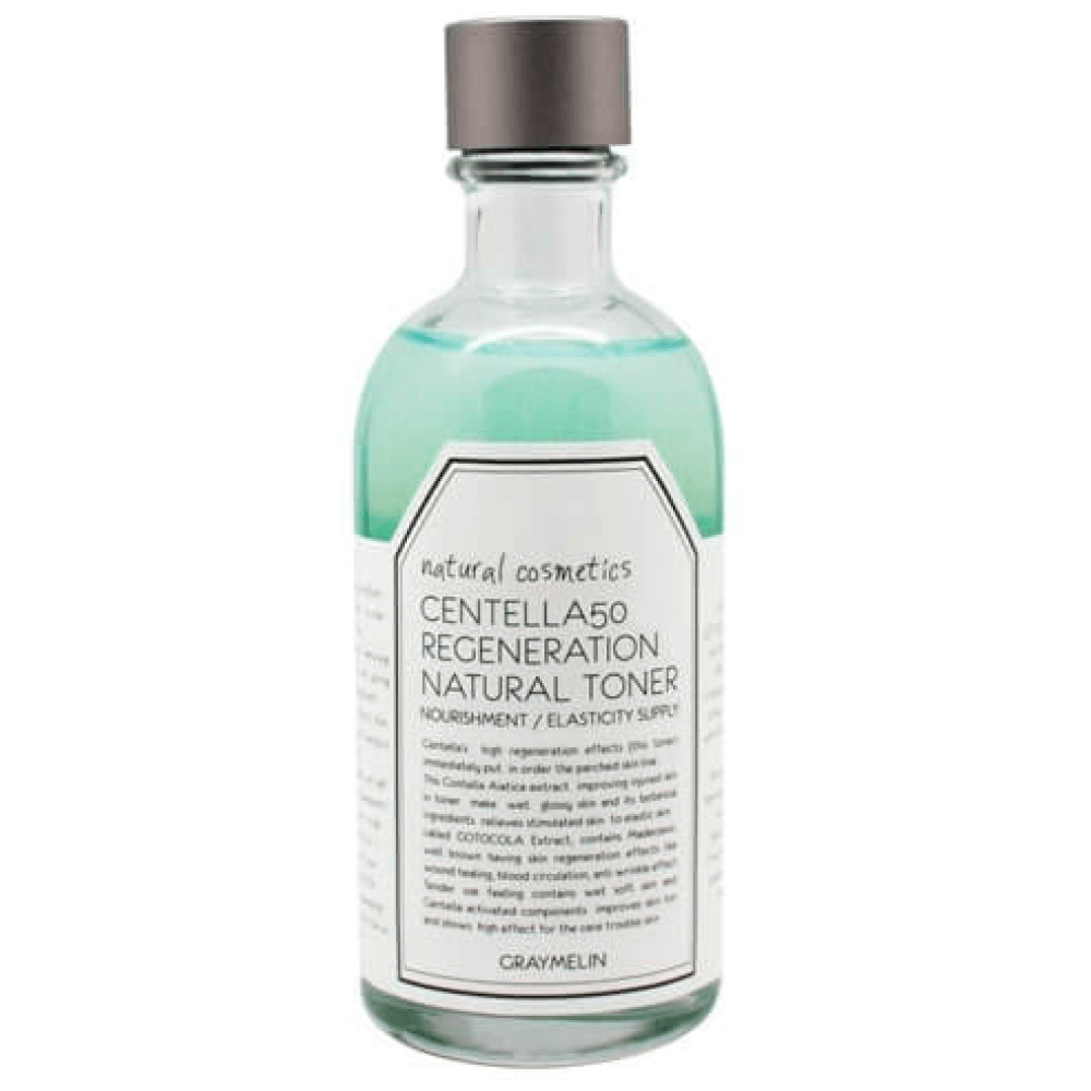 Восстанавливающий тонер с центеллой азиатской Graymelin Centella 50 Regeneration Natural Toner помогает нормализовать водно-жировой баланс, восполнить недостаток влаги в клетках эпидермиса, улучшить цвет лица, избавиться от воспалений и акне. Средство обладает сильным заживляющим и регенерирующим действием, лечит акне и воспаления, повышает эластичность эпидермиса и благоприятно воздействует на кожу с куперозом.