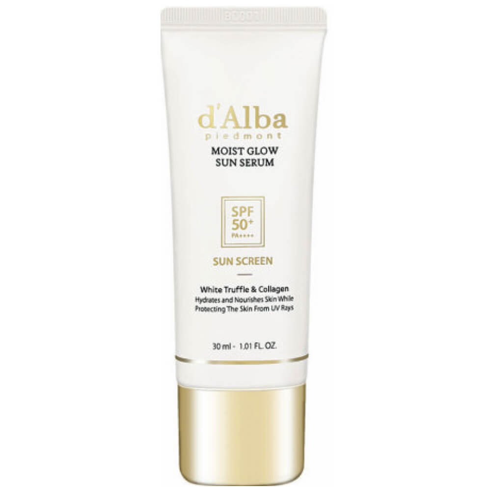 Санскрин с трюфелем d'Alba Moist Glow Sun Serum White Truffle&Collagen Sun Screen SPF50+ PA++++ защищает от ультрафиолета, предотвращает появление пигментных пятен, солнечных ожогов и фотостарения. Увлажняет, успокаивает и поддерживает эластичность, замедляет возрастные изменения, подавляет окислительный стресс. Формула основана на экстракте коллагена и содержит итальянский трюфель, центеллу азиатскую и её производные, экстракт кофе, сахаромицеты, масло апельсина и церамиды.