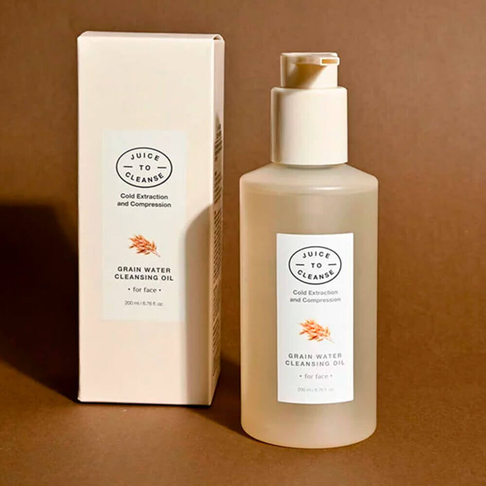 Лёгкое увлажняющее гидрофильное масло с рисом Juice To Cleanse Grain Water Cleansing Oil имеет невесомую текстуру, которая отлично распределяется по коже, смывая водостойкий и пигментированный макияж, оставляя ощущение увлажнённости после умывания. Продукт препятствует появлению пигментации, очищает поры, удаляет ороговевшие клетки, осветляет сальные нити и чёрные точки. Формула на 95% состоит из компонентов, ухаживающих за кожей. Содержит масла рисовых отрубей и овса, экстракт лимона, растительный комплекс Platowhite-C, сок алоэ и кокоса, арбутин, экстракт гриба мацутакэ и цветной капусты.