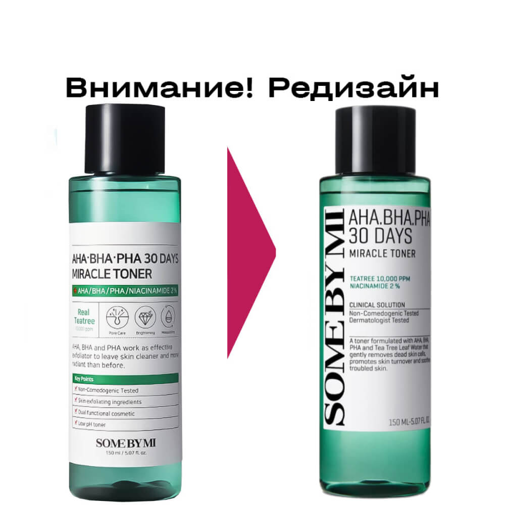 Кислотный очищающий тоник для проблемной кожи Some By Mi AHA-BHA-PHA 30 Days Miracle Toner с маслом чайного дерева и 3 видами кислот. Мультифункциональное средство работает сразу в нескольких направлениях: очищает от загрязнений и излишков себума; мягко отшелушивает, обновляет клетки эпидермиса и регулирует жирность кожи, ускоряет заживление воспалений и устраняет постакне, помогает в борьбе с чёрными точками и сужает поры. Содержит AHA-, BHA- и PHA-кислоты, масло чайного дерева, ниацинамид, экстракты гамамелиса, лотоса, ласточкиного гнезда и папайи.