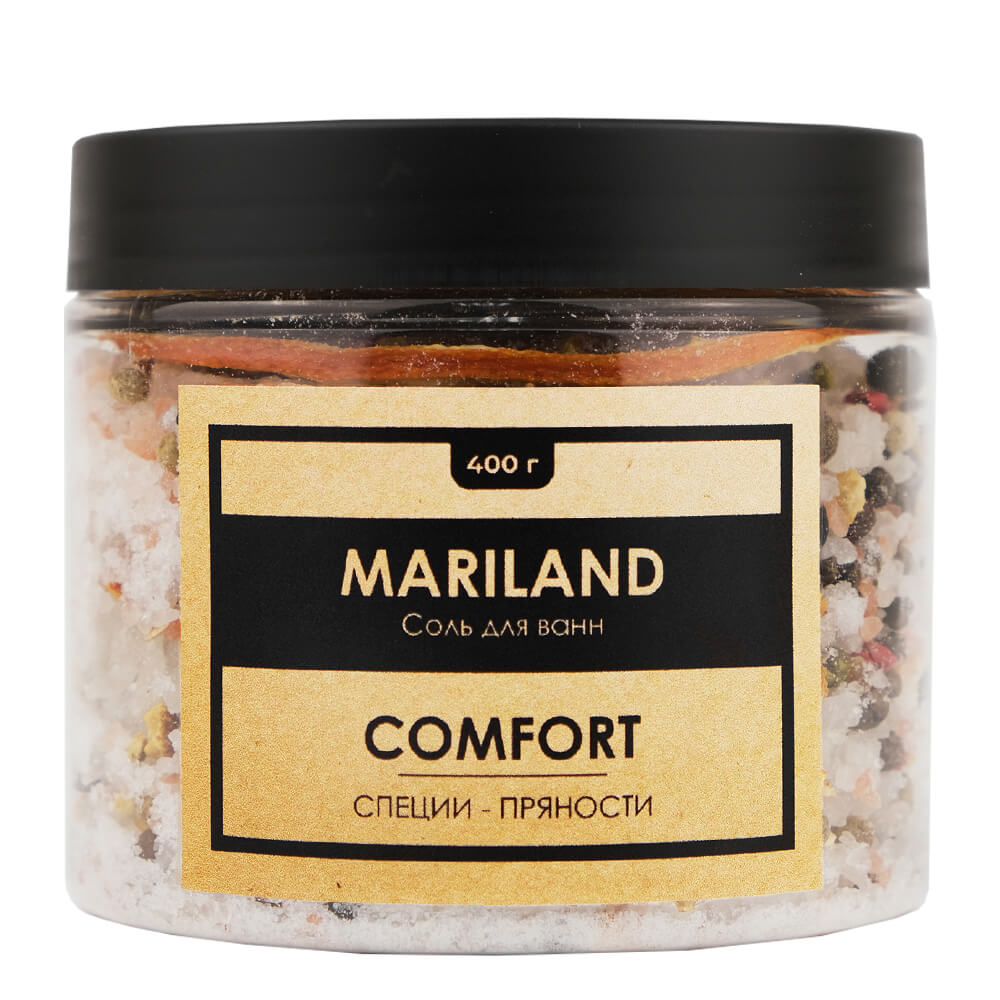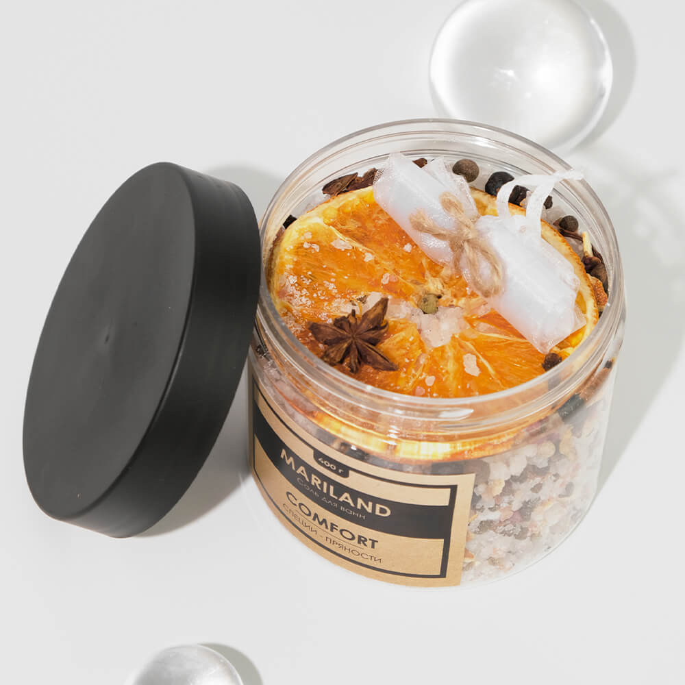 Расслабляющая соль для ванн с пряностями и специями Mariland Comfort Sea Salt с тёплым и праздничным ароматом апельсина, корицы и гвоздики создаёт домашнюю и уютную атмосферу, которая дарит комфорт и помогает восстановиться после долгого дня. Натуральный комплекс из 3 видов морской соли оздоравливает тело, а эфирные масла апельсина, мандарина, корицы и гвоздики благоприятно влияют на эмоциональное состояние, устраняя стресс и нервное напряжение.