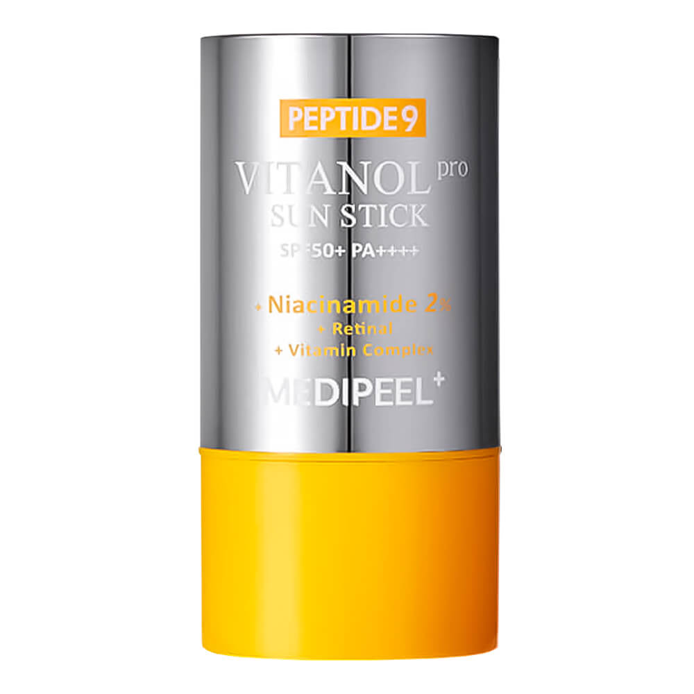 Солнцезащитный стик для выравнивания тона MEDIPEEL Peptide 9 Vitanol Sun Stick PRO SPF50+ PA++++ не только предотвращает повреждение кожи, вызванное UVA- и UVB-лучами, но и осветляет пигментацию, оказывает мощное антиоксидантное действие. Средство защищает от солнечных ожогов, пигментных пятен и признаков фотостарения, сокращает глубину морщин, выравнивает тон, уменьшает видимость веснушек и постакне. Придаёт здоровое сияние, разглаживает текстуру кожи. Содержит химические УФ-фильтры нового поколения, 2% ниацинамида, 9 пептидов, витаминный комплекс Vitanol, ретиналь, коллаген, липиды, эктоин и растительный комплекс Melazero®.