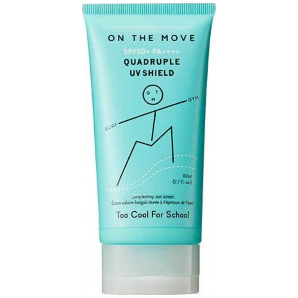Стойкий солнцезащитный крем Too Cool For SchoolOn The Move Quadruple UV Shield SPF50+ PA++++ прекрасно подойдет для любителей активного образа жизни: средство устойчиво к воздействию влаги и пота и обеспечивает надежную защиту от солнца на протяжении длительного времени. Содержит экстракты центеллы и ромашки, ниацинамид. В составе средства — химические солнцезащитные фильтры нового поколения.