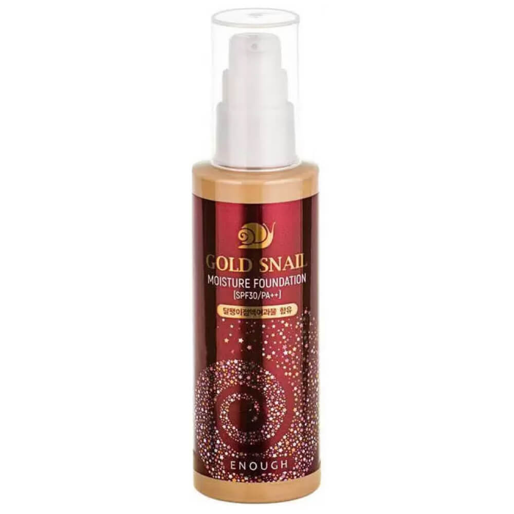Омолаживающий тональный крем с муцином улитки Enough Gold Snail Moisture Foundation SPF30 PA++ идеально подходит для зрелой кожи. Обладает отличной маскирующей способностью, скрывает несовершенства, морщинки и пигментацию. Средство отличается прекрасной стойкостью в течение дня, не провоцирует жирный блеск и чувство стянутости. Способствует обновлению кожного покрова и замедляет процессы старения. Содержит физические солнцезащитные фильтры.