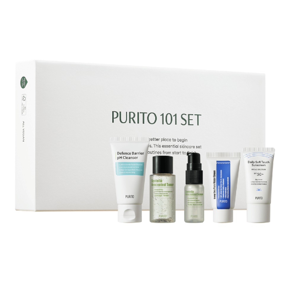 Дорожный набор базовых средств для ухода за кожей Purito 101 Set включает в себя универсальные средства для мягкого очищения и качественного увлажнения. Обладает выраженным успокаивающим и заживляющим действием, помогает снять зуд и раздражения. Укрепляет барьерные функции, восстанавливает повреждённую липидную мантию и нормализуют кислотно-щелочной баланс эпидермиса.