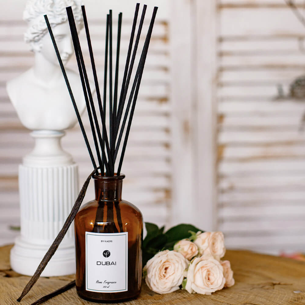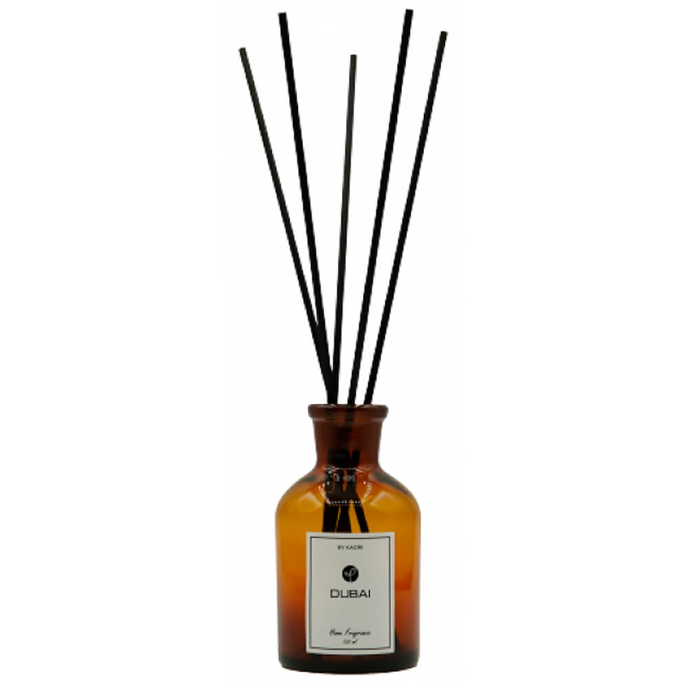 Ароматический диффузор BY KAORI «DUBAI» с восточным ароматом розы и удового дерева. Диффузор состоит из изящного стеклянного флакона с ароматической жидкостью и палочками микрофибры, которые наполняют помещение ароматом любимой парфюмерной композиции. Обладает сверхвысокой степенью насыщенности, подходит для больших пространств.