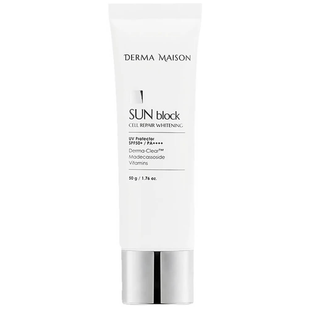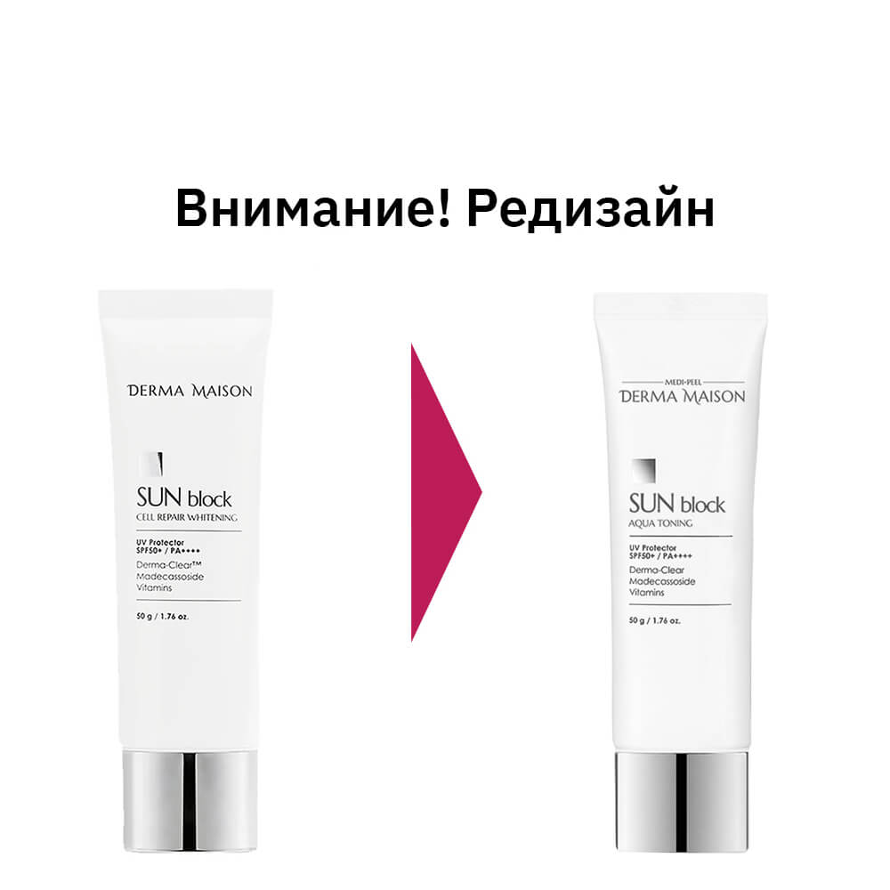 Осветляющий солнцезащитный крем Medi-PeelDerma Maison Sun Block Cell Repair Whitening SPF 50+ PA++++ защищает кожу от повреждений, ожогов и фотостарения, вызванного ультрафиолетовым излучением, не оставляет липкости, имеет воздушную текстуру. Средство выравнивает тон и уменьшает видимость пигментных пятен, предотвращает появление новой пигментации. Содержит EGF, пептиды, витаминный комплекс, ниацинамид, CICA-комплекс и химические фильтры нового поколения.