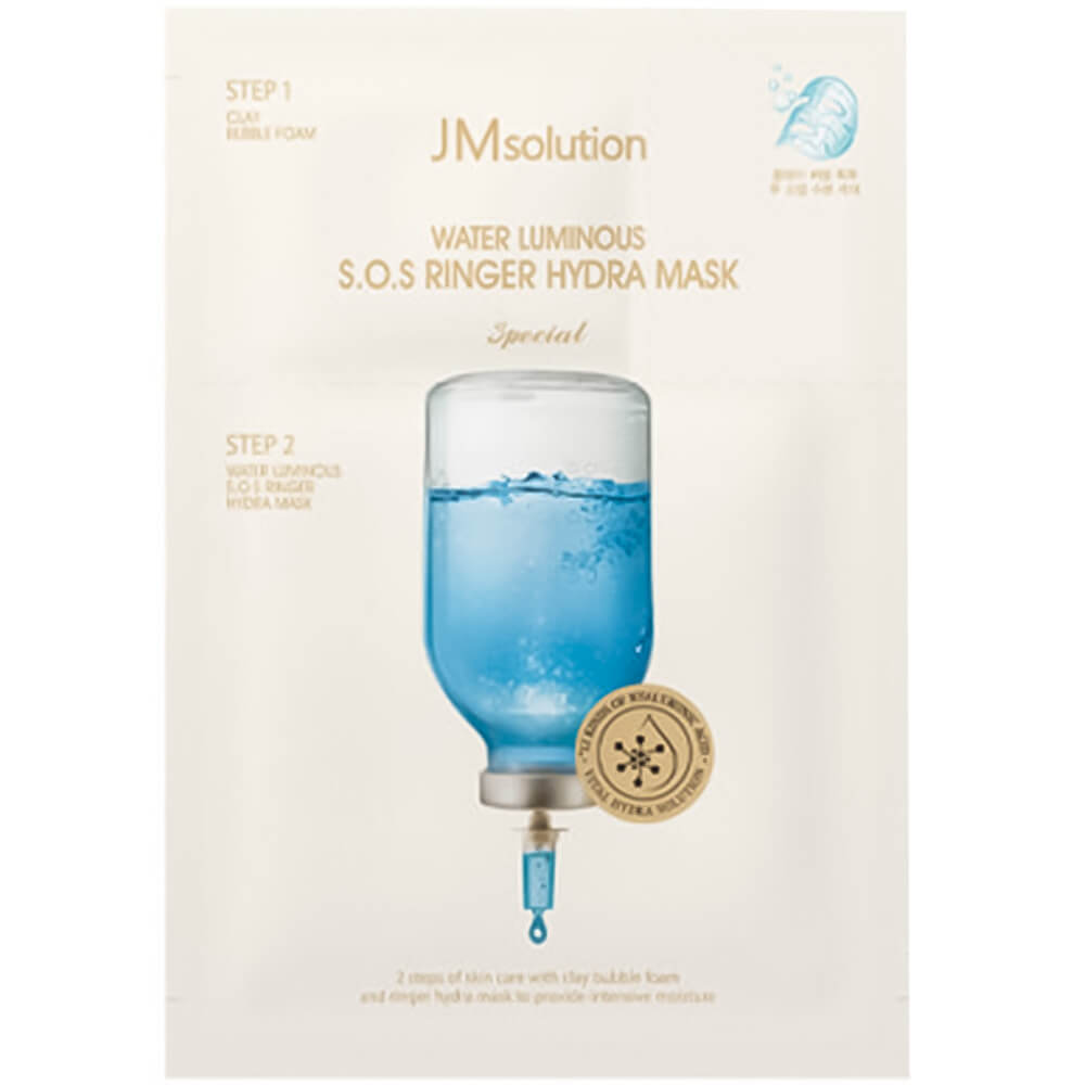 Двухступенчатая увлажняющая тканевая маска JMsolution Water Luminous S.O.S Ringer Hydra Mask Special одновременно очищает поры, вытягивая из них все загрязнения, и интенсивно увлажняет, устраняя сухость и чувство стянутости. Средство содержит глину, 5 видов гиалуроновой кислоты, пантенол и аллантоин.
