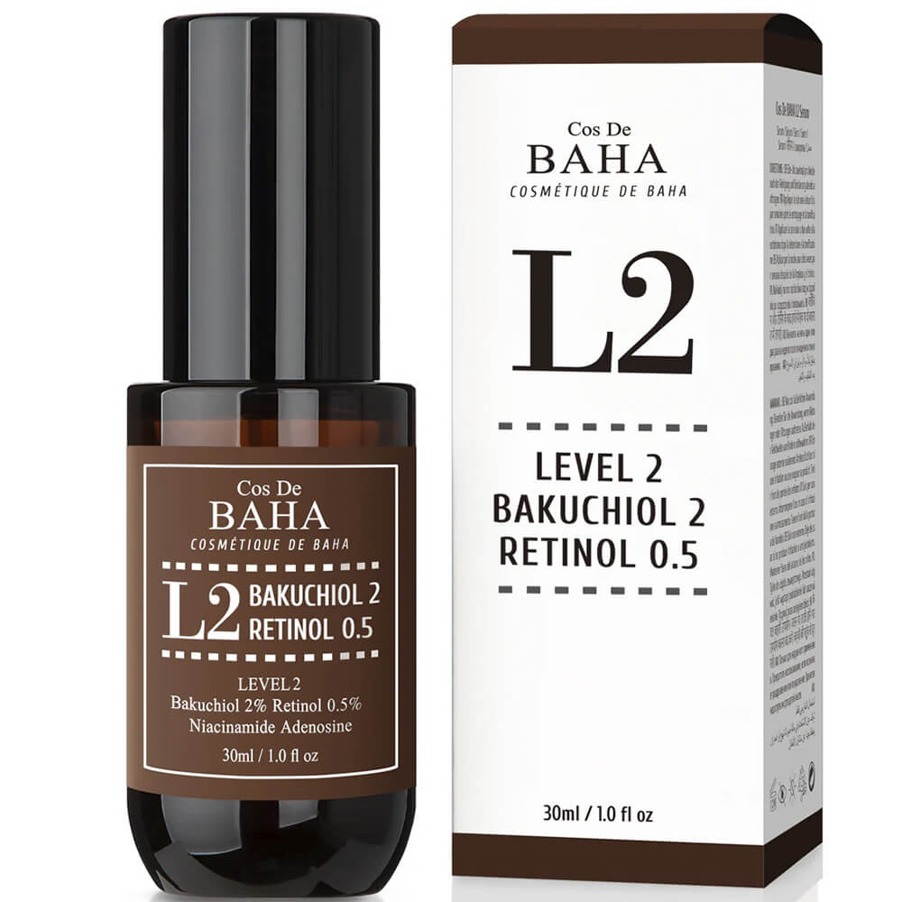 Антивозрастная сыворотка с бакучиолом и ретинолом Cos De Baha L2 Bakuchiol & Retinol Serum стимулирует обновление кожи, разглаживает рельеф и выравнивает тон, уменьшает признаки возрастных изменений. Средство сокращает глубину морщин, повышает упругость и плотность, способствует осветлению пигментации и постакне, препятствует воспалению. Лёгкая текстура быстро впитывается, не оставляет липкости. Содержит 2% бакучиола, 0,5% ретинола, ниацинамид, аденозин, пантенол, аллантоин и растительные экстракты.