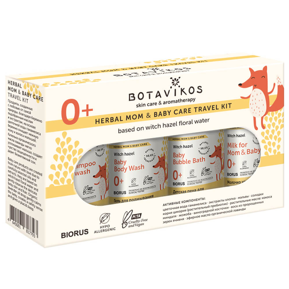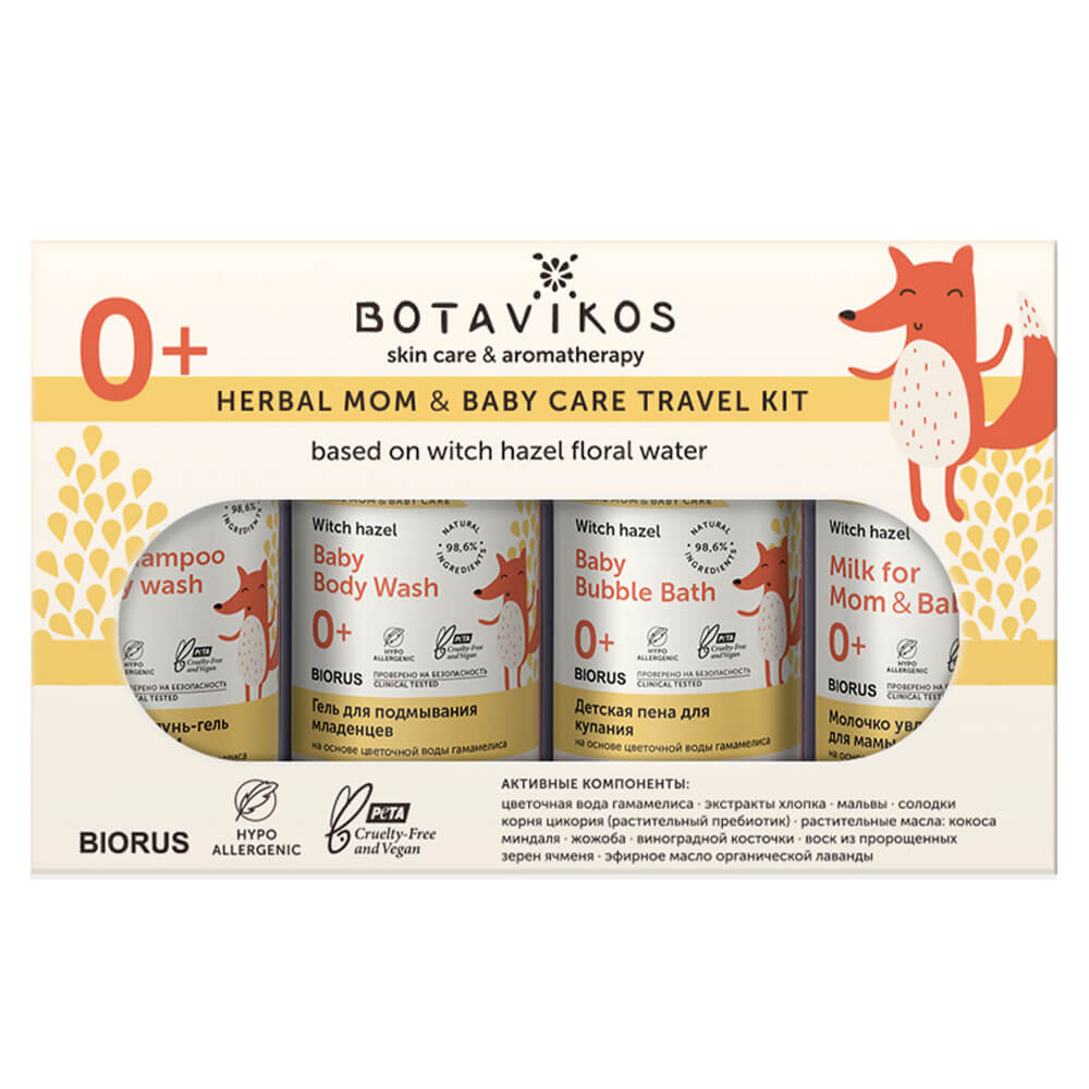 Детский travel-набор средств для мам и малышей Botavikos Travel Kit: Herbal Mom & Baby содержит натуральные гипоаллергенные продукты для очищения и увлажнения даже самой чувствительной и детской кожи. Все средства основаны на цветочной воде гамамелиса, которая смягчает, успокаивает и обладает противовоспалительным эффектом. Компактный формат позволяет брать набор с собой в путешествие и всегда держать под рукой нужное средство.