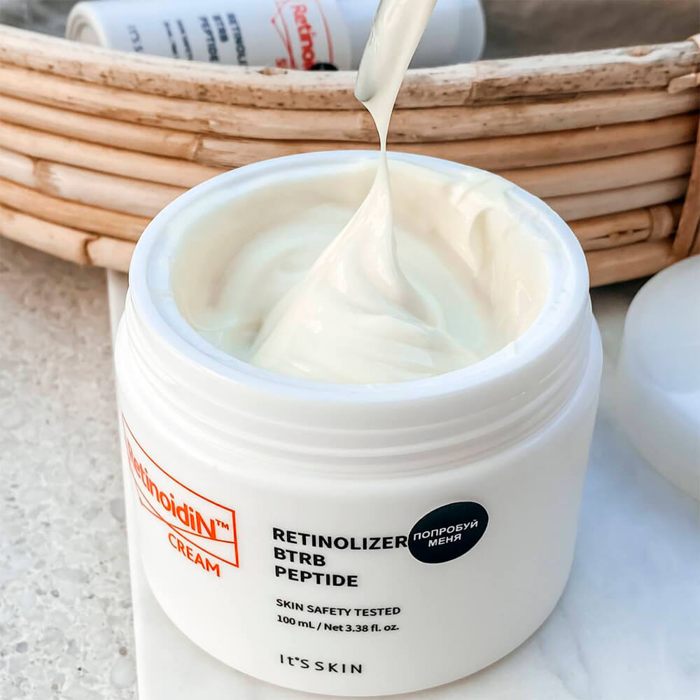 Антивозрастной крем с ретинолом и аргирелином It's Skin Retinoidin Cream борется с возрастными изменениями кожи: разглаживает, подтягивает, придаёт упругость и эластичность, уменьшает видимость морщин. Средство нормализует выработку кожного сала, предотвращает появление воспалений и чёрных точек, не пересушивает, делает кожу мягкой и бархатистой. Содержит комплекс Retinolizer, пептид аргирелин, ниацинамид, аденозин, сквалан, церамиды и хитозан.