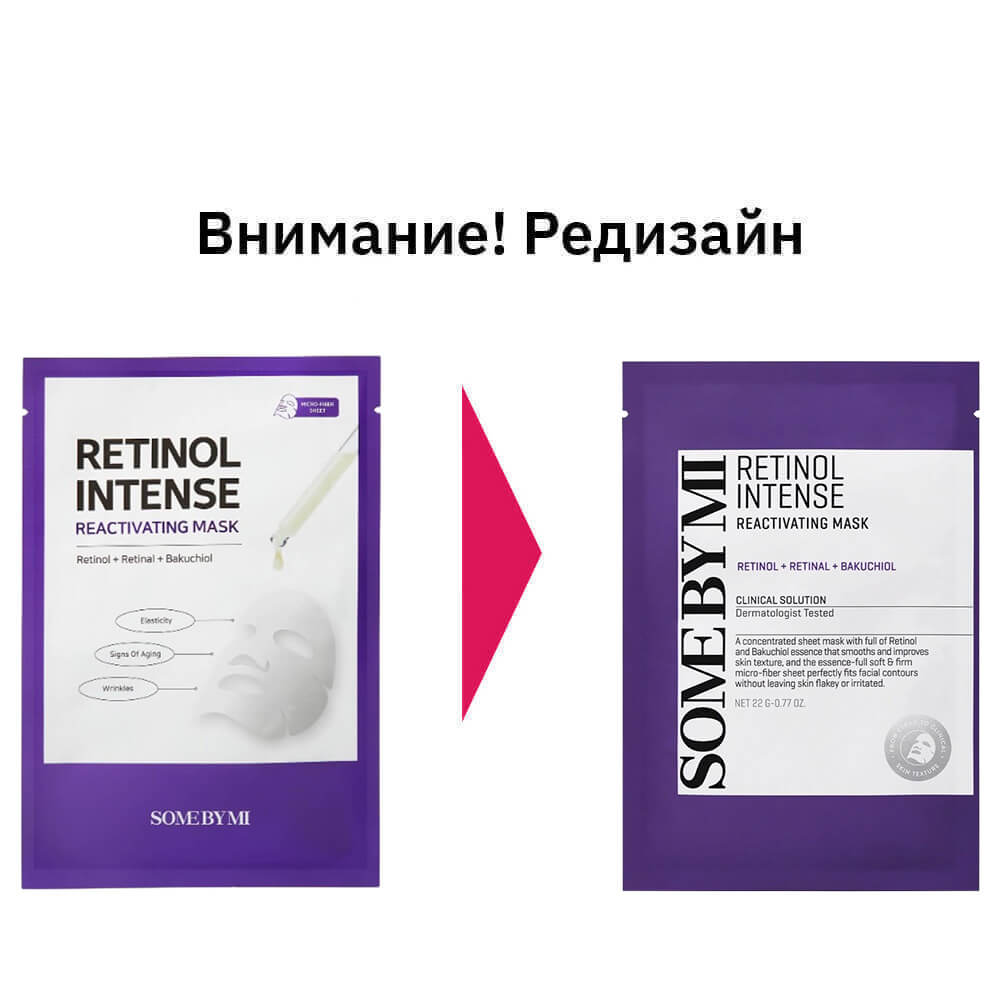 Антивозрастная тканевая маска с ретинолом и бакучиолом Some By Mi Retinol Intense Reactivating Mask активирует внутренние процессы обновления, за счёт чего разглаживает, смягчает и повышает эластичность кожи, уменьшая выраженность морщин, пигментации и других возрастных изменений. Маска сглаживает текстуру кожи, сужает расширенные поры и смягчает огрубевшие участки. Гипоаллергенное средство не вызывает раздражения и подходит для всех типов кожи. Содержит ретинол, ретиналь, бакучиол, 10 видов гиалуроновой кислоты и комплекс центеллы.