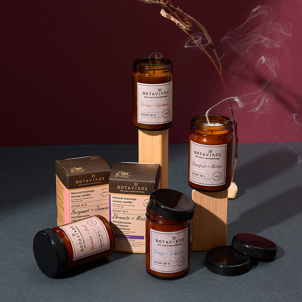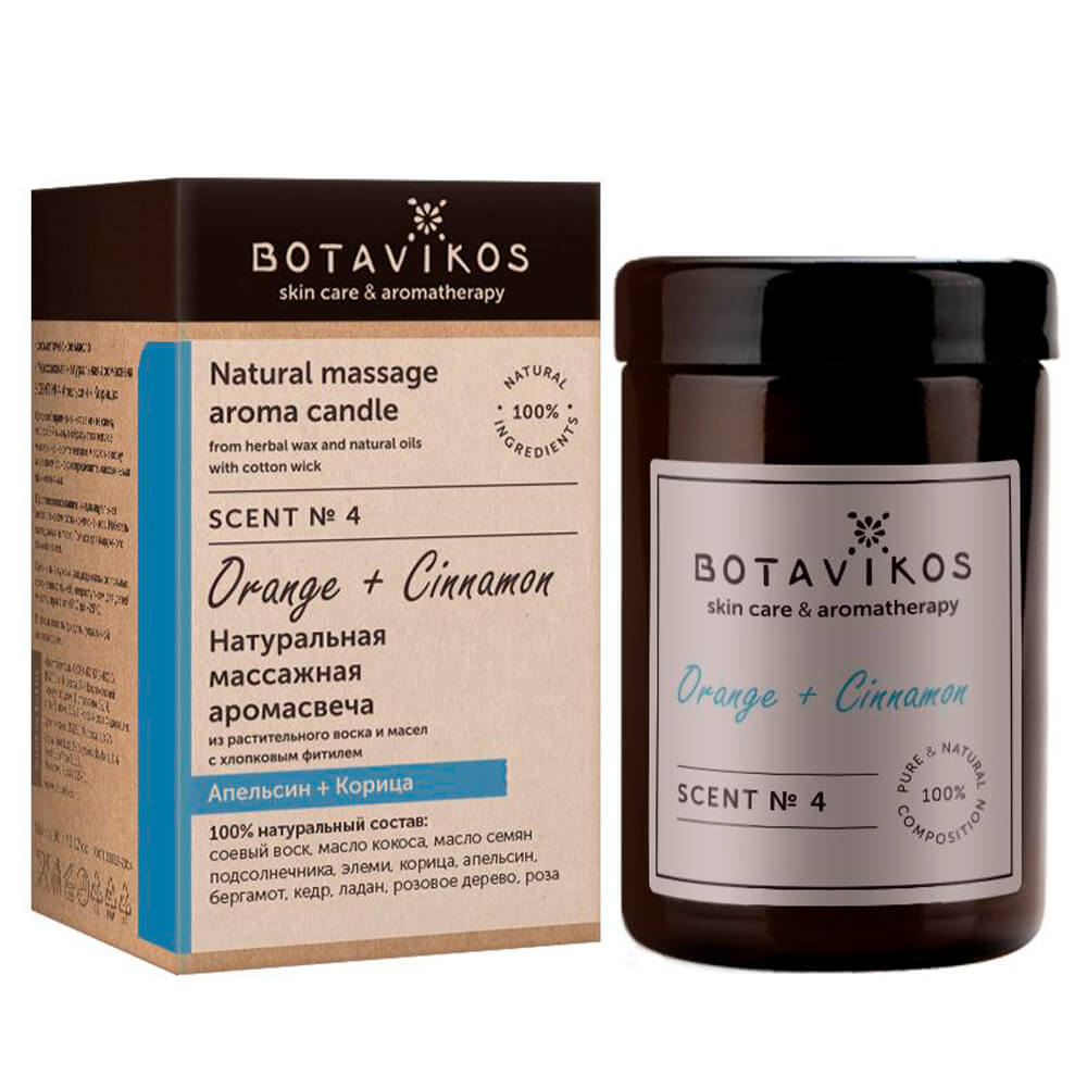 Массажная аромасвеча с растительным воском и эфирными маслами Botavikos Natural Massage Aroma Candle дарит неповторимый аромат парфюмерных композиций на основе масел, которые улучшают настроение, преображают интерьер и создают особую атмосферу. Свеча с хлопковым фитилём на основе карнаубского, канделильского, соевого и рисового воска прекрасно подходит для массажа: при плавлении воск и питательные масла растворяются, превращаясь в ароматическое массажное масло, которое увлажняет кожу. Свеча не выделяет вредных веществ при горении. Время горения — 15 часов.