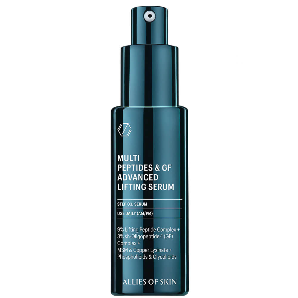 Мультипептидная лифтинг-сыворотка с EGF Allies of Skin Multi Peptides&GF Advanced Lifting Serum — мощное средство для омоложения кожи, которое сокращает глубину морщин в области лба, вокруг глаз и губ, в зоне носогубных складок. Сыворотка повышает упругость и плотность кожи, придаёт эластичность, увлажняет и улучшает текстуру кожи, запуская синтез коллагена и повышая клеточную активность. Отлично подходит для кожи с недостатком объёма. Имеет лёгкую кремовую текстуру. Содержит 3% эпидермального фактора роста (EGF), 9% пептидного лифтинг-комплекса, 2% растительного комплекса Dermcom, лизинат/пролинат меди, липиды, экстракт центеллы и масло подсолнечника.