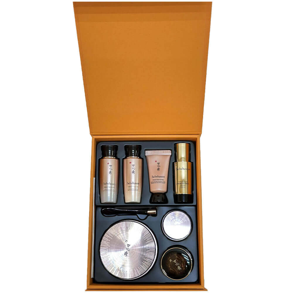 Омолаживающий премиум-набор с кремом Sulwhasoo Timetreasure Invigorating Cream Anti-Aging Set содержит полноразмерный антивозрастной крем и 6 миниатюр, которые закрывают все потребности в уходе. Тоник, эмульсия, крем для век, ночная маска, а также сыворотка и крем разглаживают, смягчают и уплотняют кожу, уменьшают видимость морщин, стимулируют процессы регенерации, выравнивают тон и предотвращают сухость. Стильный минималистичный дизайн и обилие продуктов делают набор отличным вариантом подарка и позволяют познакомиться с целой серией средств бренда Sulwhasoo. Формулы средств содержат экстракты японской сосны, лотоса и гриба мацутакэ, сапонины женьшеня, мёд, трегалозу и фитостерил.