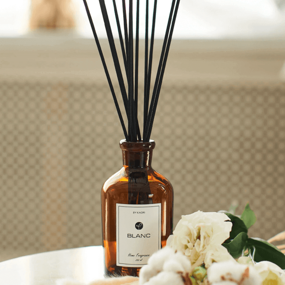 Ароматический диффузор BY KAORI «BLANC» с лёгким свежим ароматом белого хлопка и чистоты. Аромадиффузор представляет собой стеклянный флакон с ароматической жидкостью и палочками из микрофибры, которые позволяют наполнить дом или рабочее место ароматом вашего любимого парфюма. Обладает средней степенью насыщенности и подходит для достаточно больших пространств.