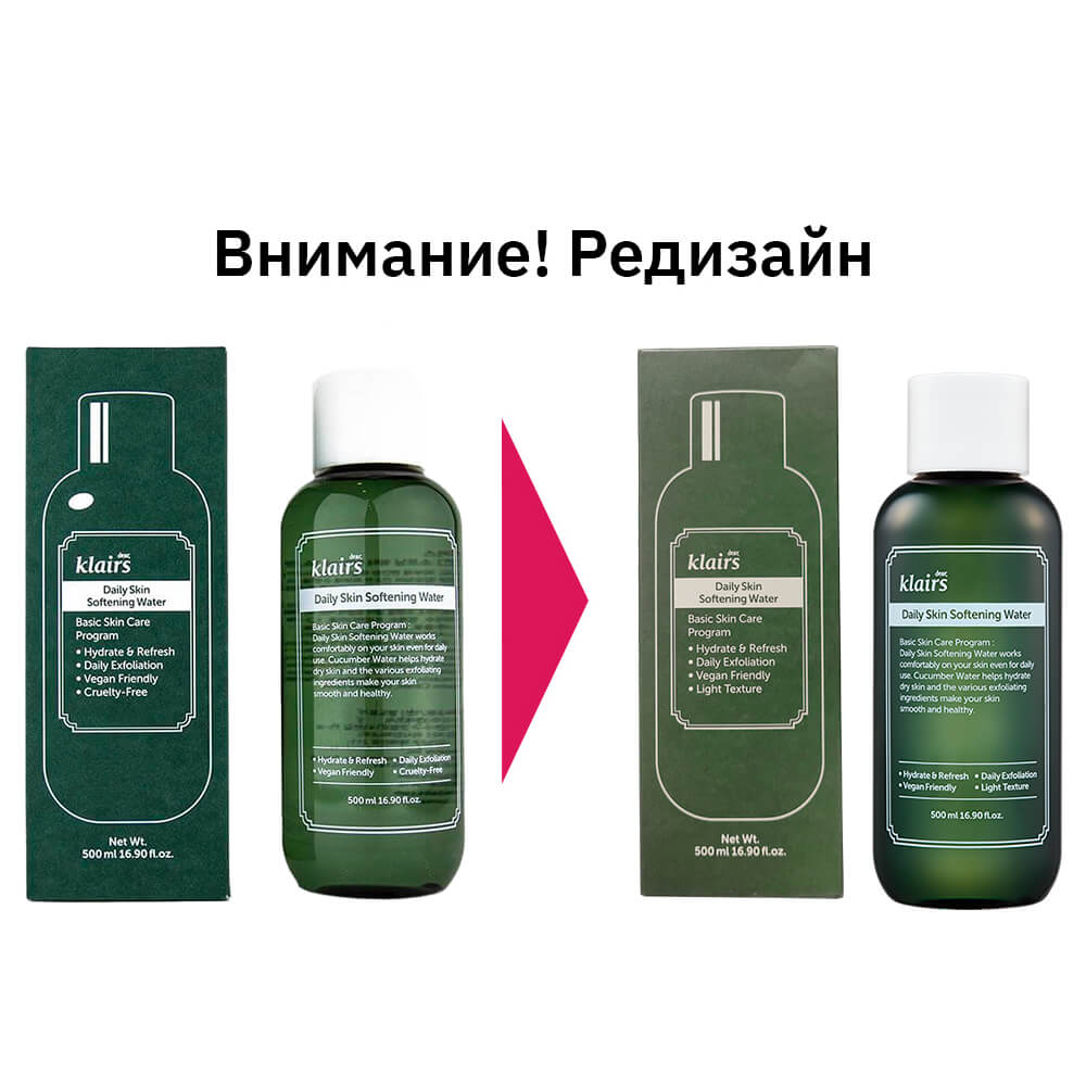Ежедневный огуречный тоник-софтнер Klairs Daily Skin Softening Skin подойдет для увлажнения, тонизирования и мягкого обновления всех типов кожи, в том числе раздраженной и чувствительной. Средство имеет натуральную формулу и не содержит в своем составе раздражающих кожу ингредиентов. Тоник освежает кожу, выравнивает тон и усиливает проникновение активных действующих компонентов последующего ухода (сыворотки, крема).