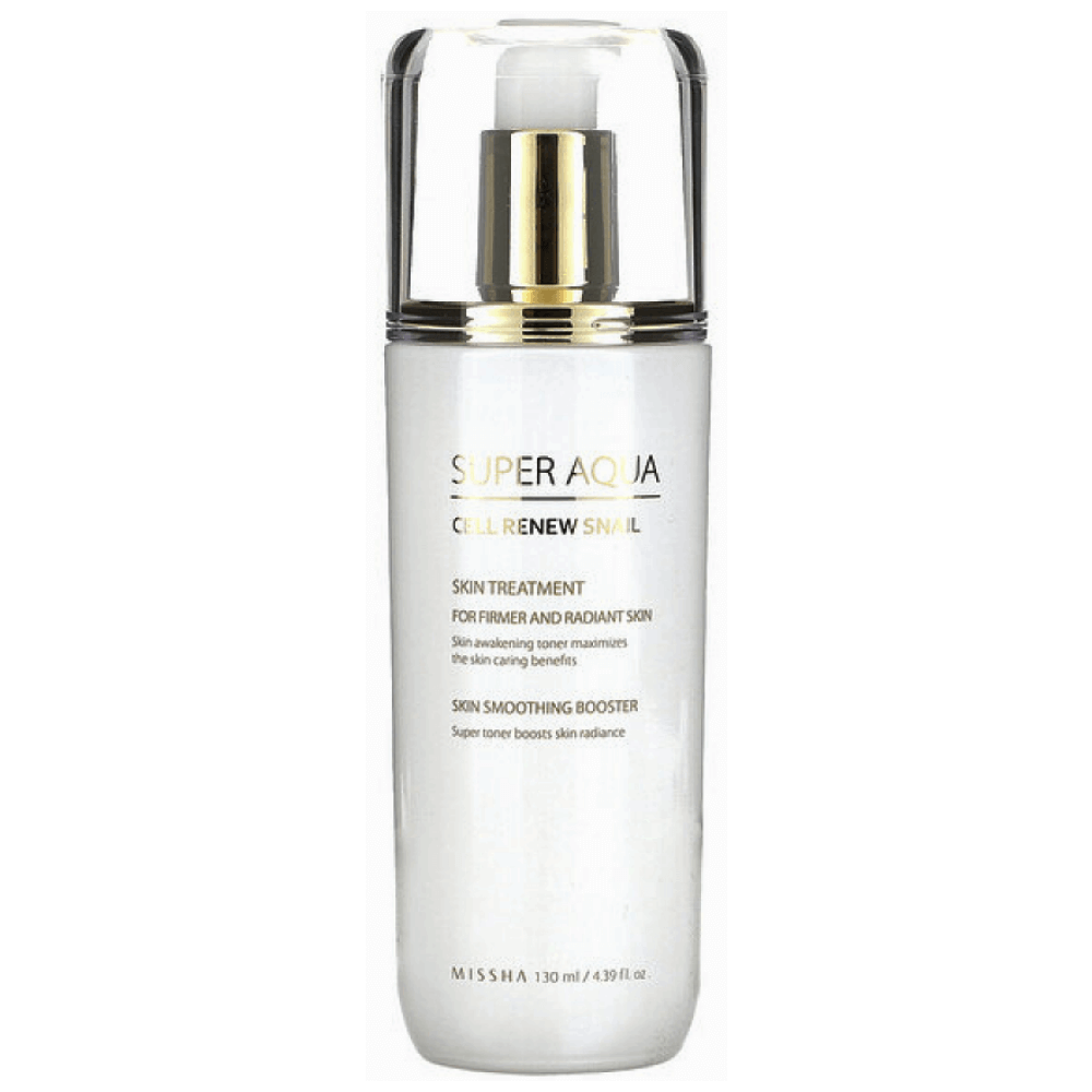 2-в-1: бустер + тонер с экстрактом улитки Missha Super Aqua Cell Renew Snail Skin Treatment, созданный для придания коже упругости и увеличения эффективности последующих этапов ухода за кожей. Благодаря легкой текстуре геля тонер легко наносится и быстро впитывается. Содержит 30% вытяжки секреции улиточной слизи.
