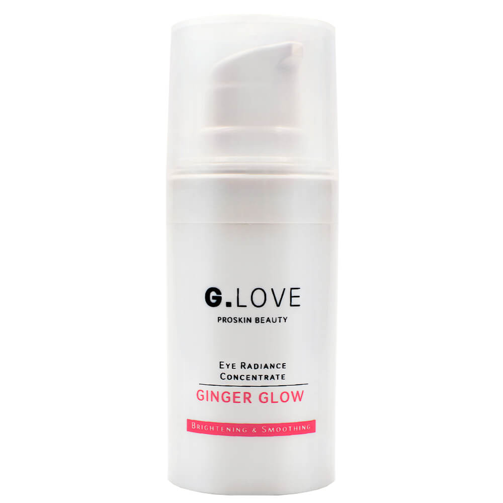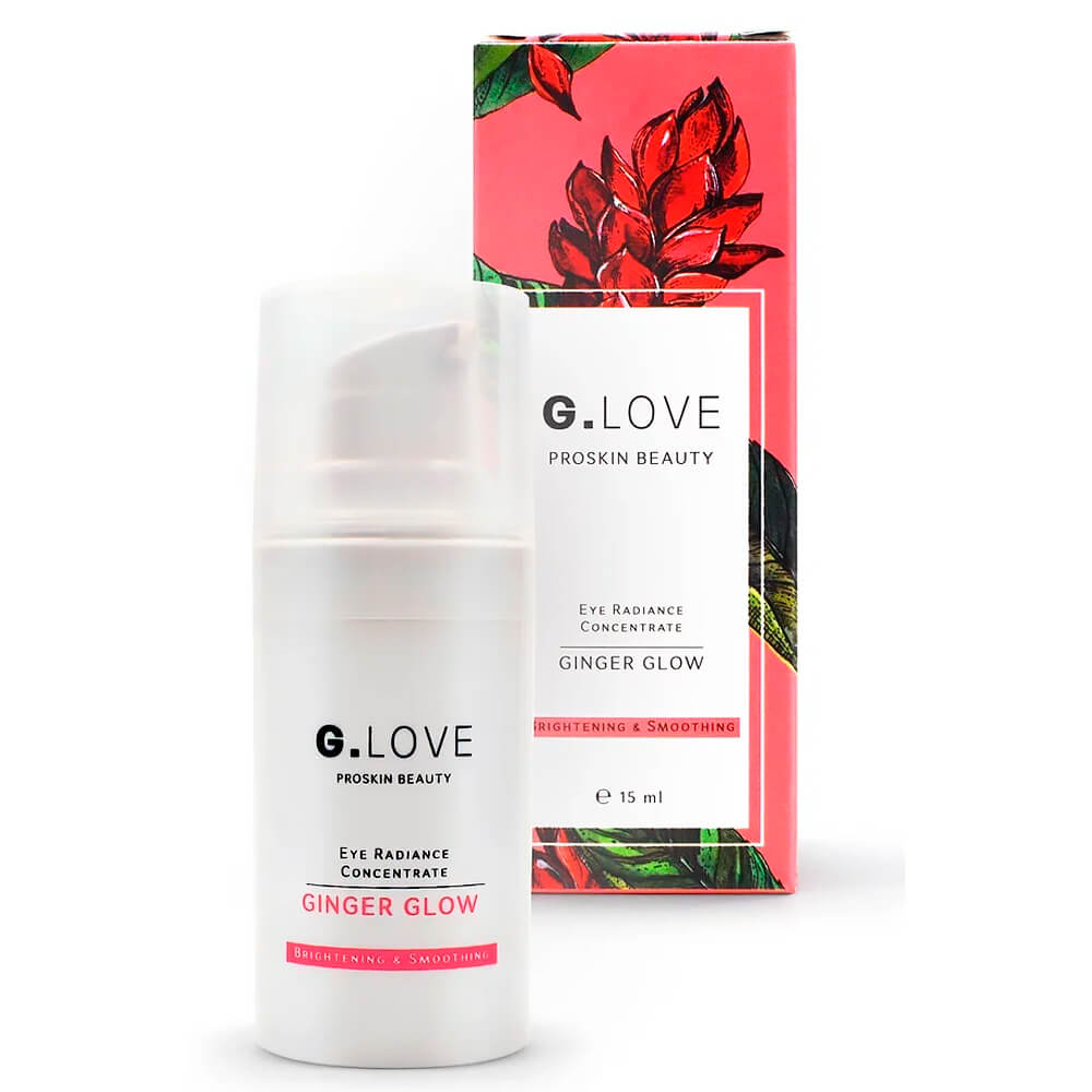 Концентрат от отёков и припухлости вокруг глаз G.Love Eye Radiance Concentrate Ginger Glow разглаживает, уплотняет и осветляет нежную кожу век, снижает отёчность, укрепляет капилляры, придаёт области вокруг глаз свежий отдохнувший вид. Средство, богатое комплексом растительных экстрактов, тонизирует и повышает эластичность, устраняя тусклость и следы усталости. Содержит пептиды, троксерутин, витамин C, зерумбон, экстракт кофе, ниацинамид и пробиотики.