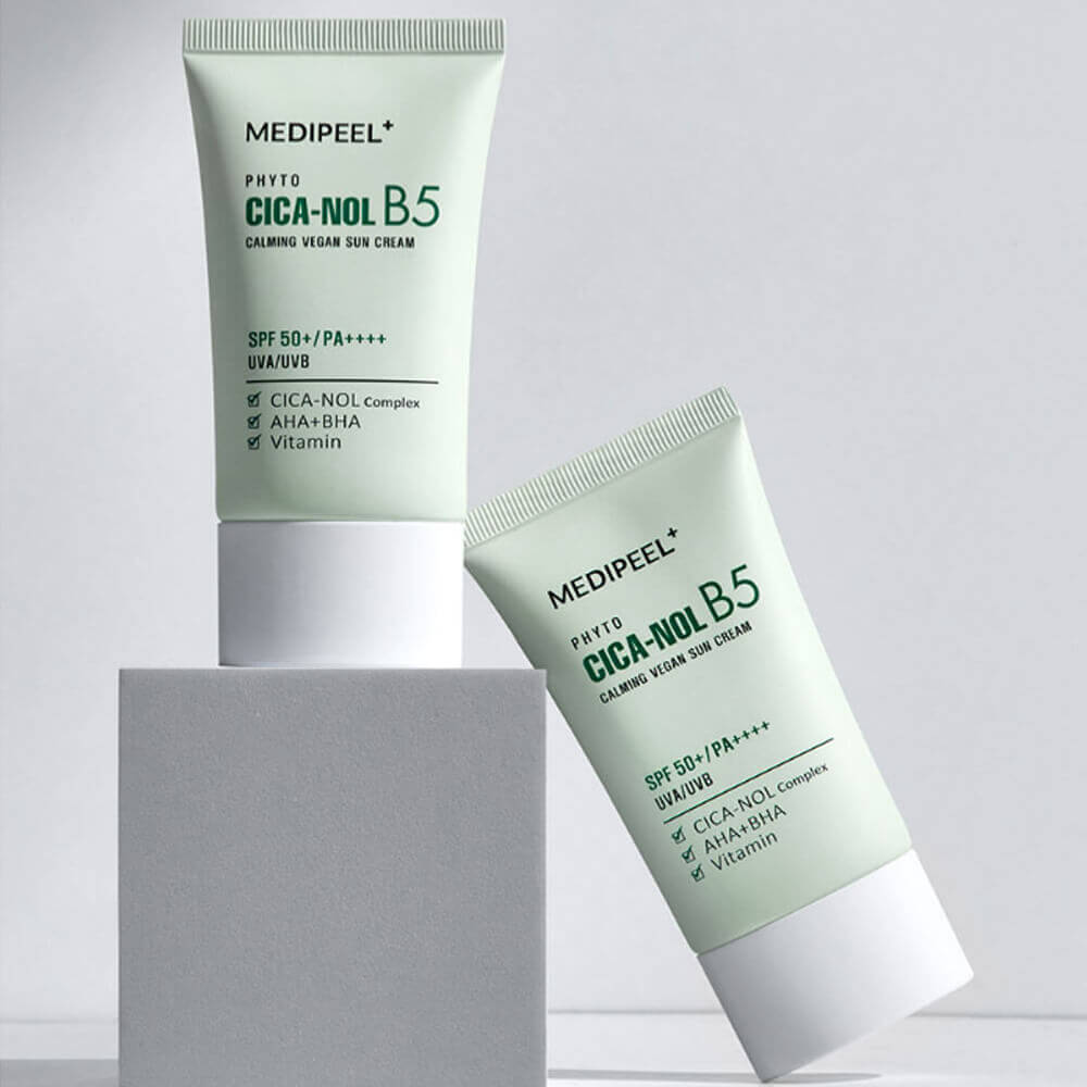 Успокаивающий санскрин с центеллой MEDIPEEL Phyto Cica-Nol B5 Calming Vegan Sun Cream SPF50+ PA++++ надёжно защищает от ультрафиолета, предотвращая появление пигментации и фотостарения, а также снимает раздражение, смягчает и увлажняет чувствительную кожу. Выравнивает тон, не оставляет липкости и белых следов. Содержит физический УФ-фильтр оксид цинка, комплекс из центеллы и пантенола Cica-Nol B5, ферментированные экстракты пшеницы и сои, AHA и BHA, комплекс витаминов и ниацинамид.