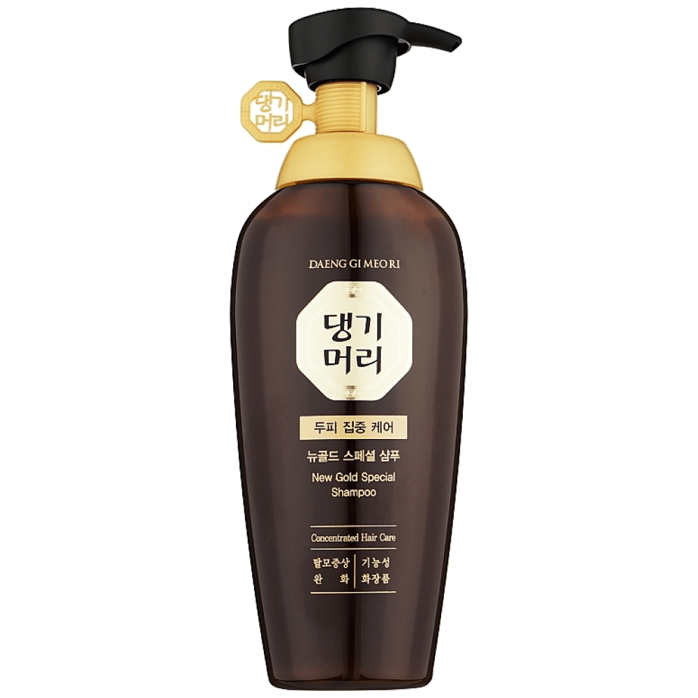 Шампунь для глубокого очищения и укрепления корней волос Daeng Gi Meo Ri New Gold Special Shampoo тщательно промывает, устраняя излишки кожного сала, пыль, загрязнения, ороговевшие частицы кожи и остатки укладочных средств, оставляя ощущение чистоты и свежести. Шампунь активирует волосяные фолликулы и улучшает микроциркуляцию, тем самым препятствует выпадению, делает волосы сильными и блестящими. Оздоравливает кожу головы, способствует уменьшению чрезмерной жирности. Содержит 35% растительных экстрактов, среди которых экстракты женьшеня, бамбука и шалфея, а также морской коллаген, кератин, пантенол, ниацинамид, BHA-кислоту, церамиды и водоросли.