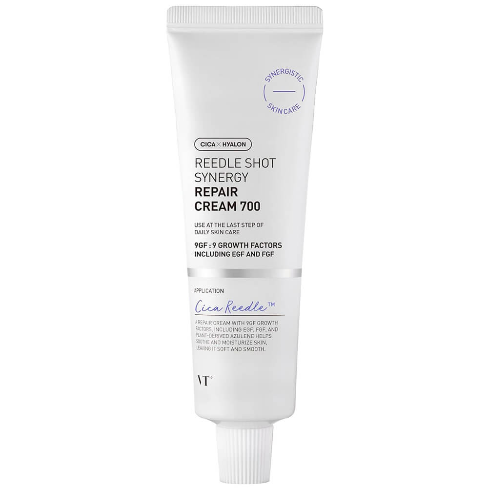 Интенсивно восстанавливающий крем с микроиглами VT Cosmetics Reedle Shot Synergy Repair Cream 700 создан для заживления кожи после использования микроигл в высокой концентрации, а также после применения других агрессивных активов: кислот, ретинола. Средство запускает регенерацию микроповреждений, увлажняет и питает. Смягчает огрубевшие участки, избавляет от шелушения, защищает от внешних раздражителей. Содержит микроиглы Cica Reedle™, 9 EGF (эпидермальные факторы роста), азулен, комплекс Cicahyalon™, церамиды, пантенол, сквалан и липиды.