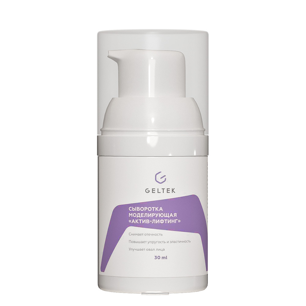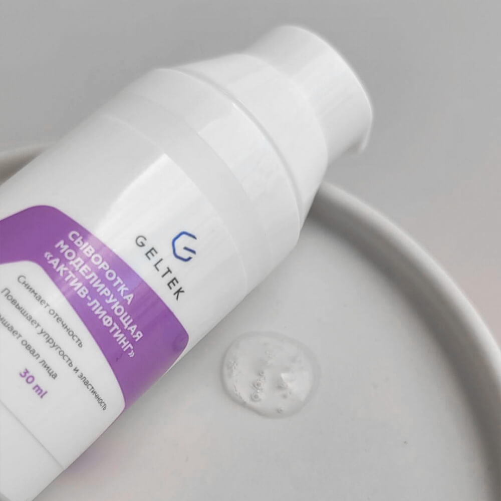 Моделирующая сыворотка от отёков Актив-лифтинг с кофеином и пуллуланом Geltek подтягивает и тонизирует кожу, а также оказывает липолитическое действие, расщепляя подкожную жировую ткань. Очерчивает овал лица, нормализует микробиоту, увлажняет и повышает устойчивость к внешним раздражителям. Содержит кофеин, пуллулан и низкомолекулярную гиалуроновую кислоту.