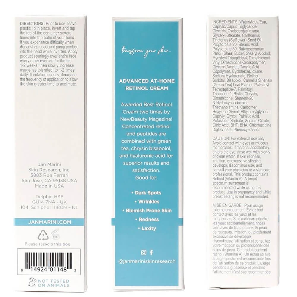 Антивозрастной крем с 0,5% ретинола Jan MariniAge Intervention Retinol Plus сокращает видимые признаки возрастных изменений, уменьшает глубину морщин и разглаживает, выравнивает тон и придаёт естественное сияние. Продукт активирует клеточное обновление, за счёт чего сглаживает неровности рельефа и улучшает текстуру кожи, смягчая и питая. Содержит ретинол, комплекс 3 пептидов, экстракт зелёного чая и бисаболол. Уровень pH 5,5.