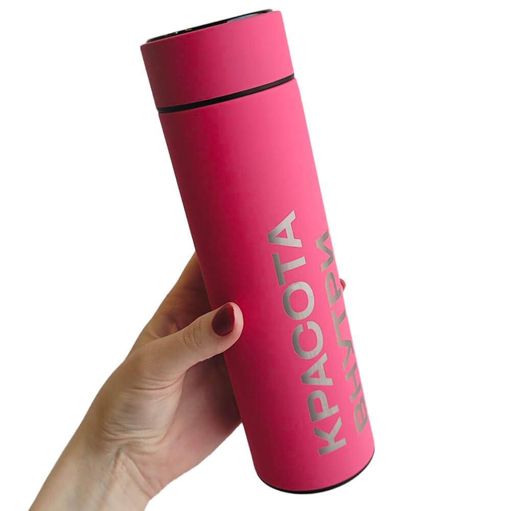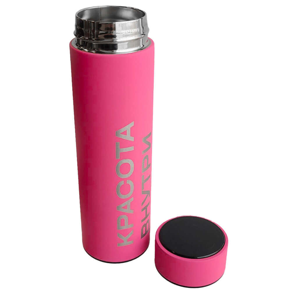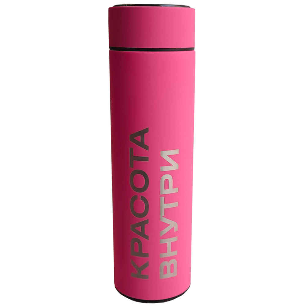 Термос с датчиком температуры «Красота внутри» Hollyshop — стильный и практичный аксессуар, который удобно брать с собой, чтобы согреваться тёплым кофе или чаем каждый день. Термос выполнен из нержавеющей стали и покрыт тактильно приятным материалом soft-touch сочного розового цвета с надписью «Красота внутри». В крышку встроен термометр и сенсорный LED-дисплей, который показывает температуру напитка, а внутри термоса есть ситечко для заваривания чая.