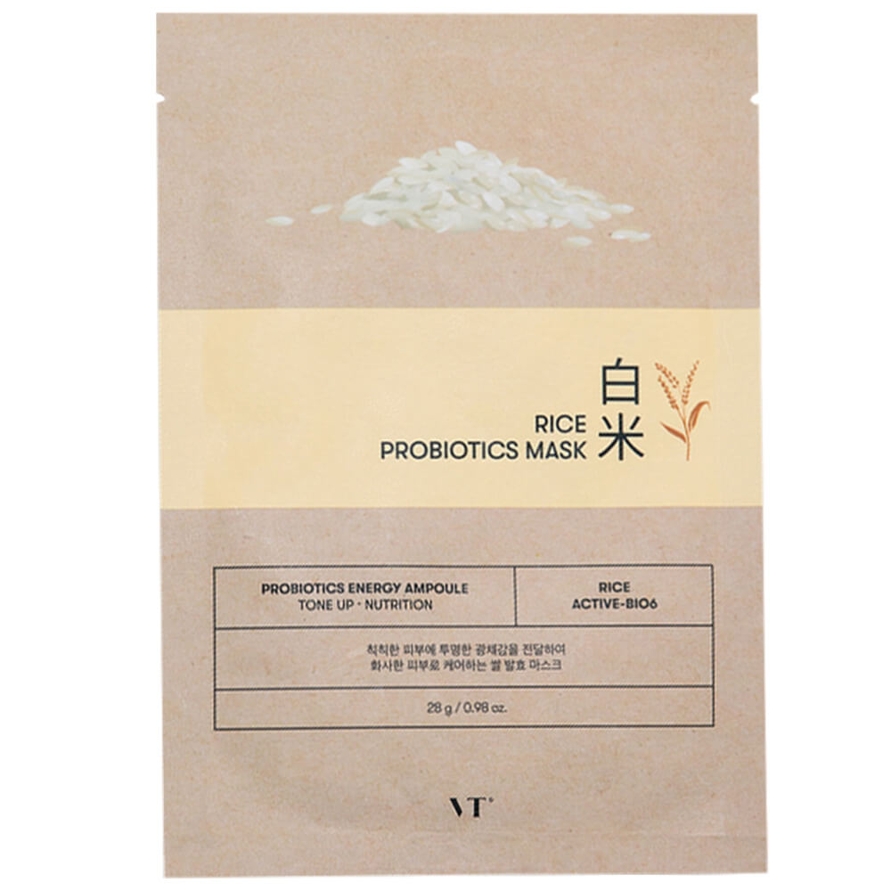 Осветляющая маска с пробиотиками VT Cosmetics Rice Probiotics Mask устраняет тусклость, выравнивает тон и возвращает коже мягкое, естественное сияние. Средство активно питает и увлажняет, поддерживает оптимальный уровень увлажненности, укрепляет защитный барьер. Содержит комплекс 6 пробиотиков и экстракты риса, киноа и овса.