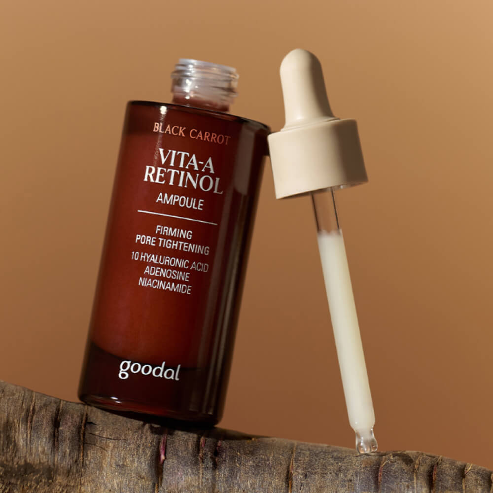 Укрепляющая ампула с ретинолом и чёрной морковью Goodal Black Carrot Vita-A Retinol Ampoule замедляет процессы старения — восстанавливает упругость и эластичность, сокращает морщины, устраняет тусклость и придаёт коже сияние. Выравнивает микрорельеф, сужает расширенные поры, смягчает огрубевшие участки. Содержит 10 видов гиалуроновой кислоты, аденозин, экстракт артишока и сои.