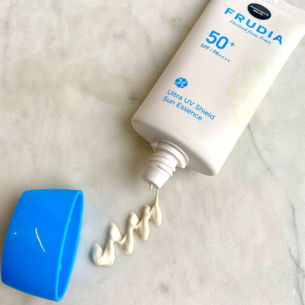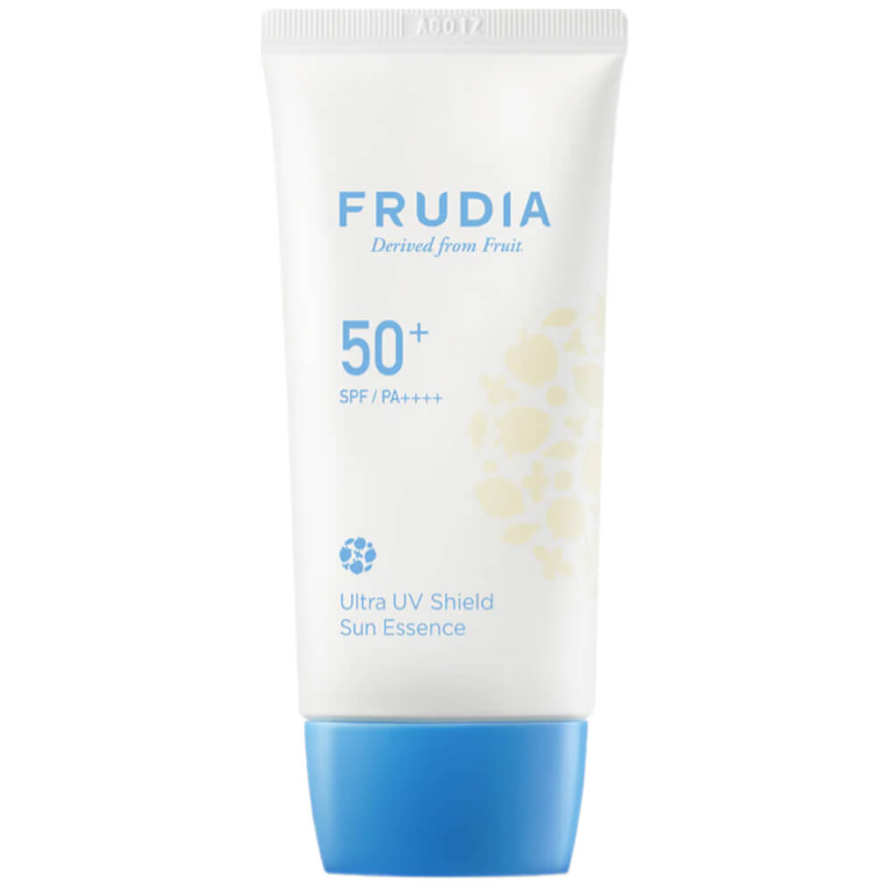 Лёгкая солнцезащитная эссенция Frudia Ultra UV Shield Sun Essence SPF50+ PA++++ имеет высокий фактор защиты от ультрафиолета и фотостарения, быстро впитывается, не оставляет липкости и жирного блеска. Подходит для всех типов кожи. Содержит химические и физические солнцезащитные фильтры.