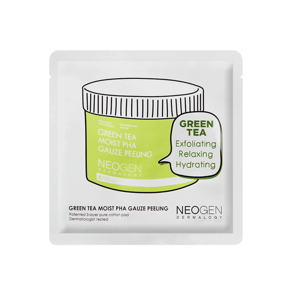 Очищающие пилинг-пэды с зелёным чаем и кислотами Neogen Green Tea Moist PHA Gauze Peeling Pad отшелушивают роговой слой, удаляя омертвевшие частицы кожи и кожное сало. Освежают, тонизируют и смягчают, выравнивают микрорельеф, придают гладкость и бархатистую текстуру. Средство запускает обновление клеток, уменьшает видимость пигментации и следов от акне. Трёхслойный двусторонний пэд имеет рельефную и мягкую стороны. Содержит комплекс кислот (AHA, BHA, PHA, LHA), экстракт зелёного чая, масло чайного дерева, азулен, экстракт алоэ и церамиды.