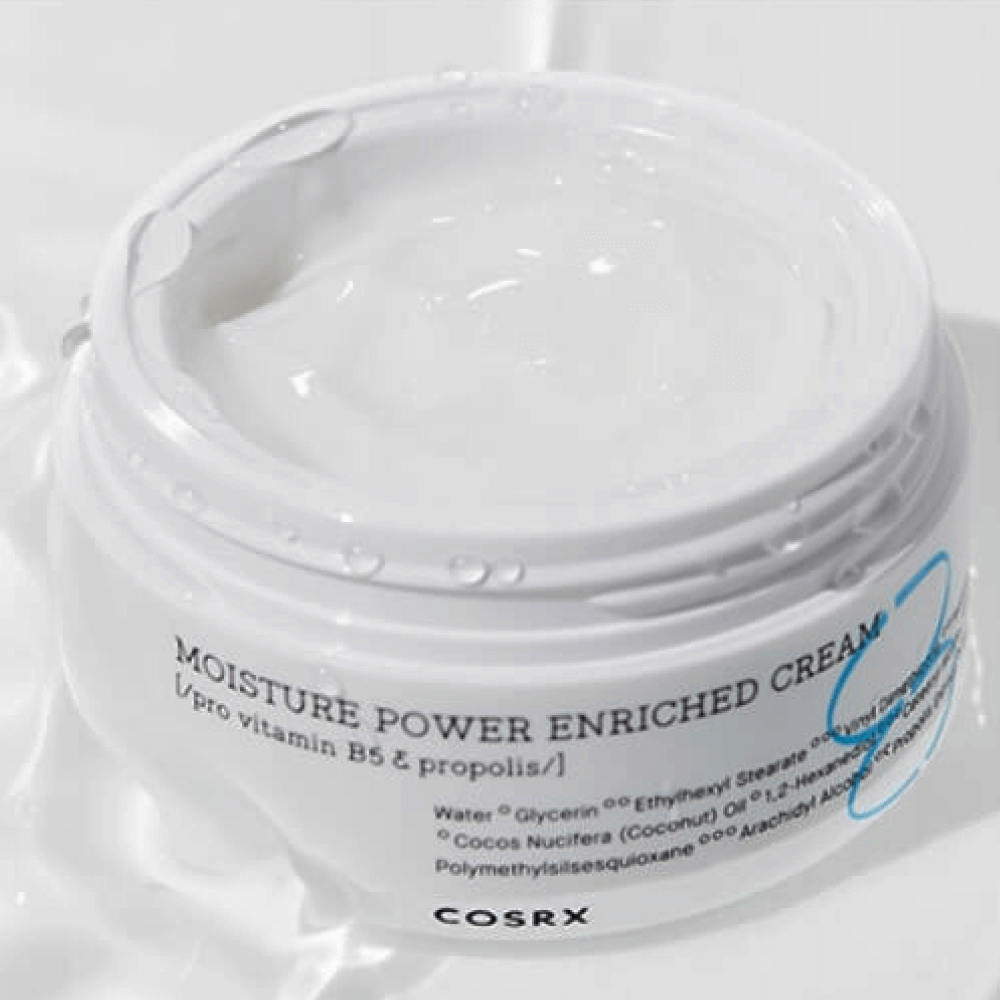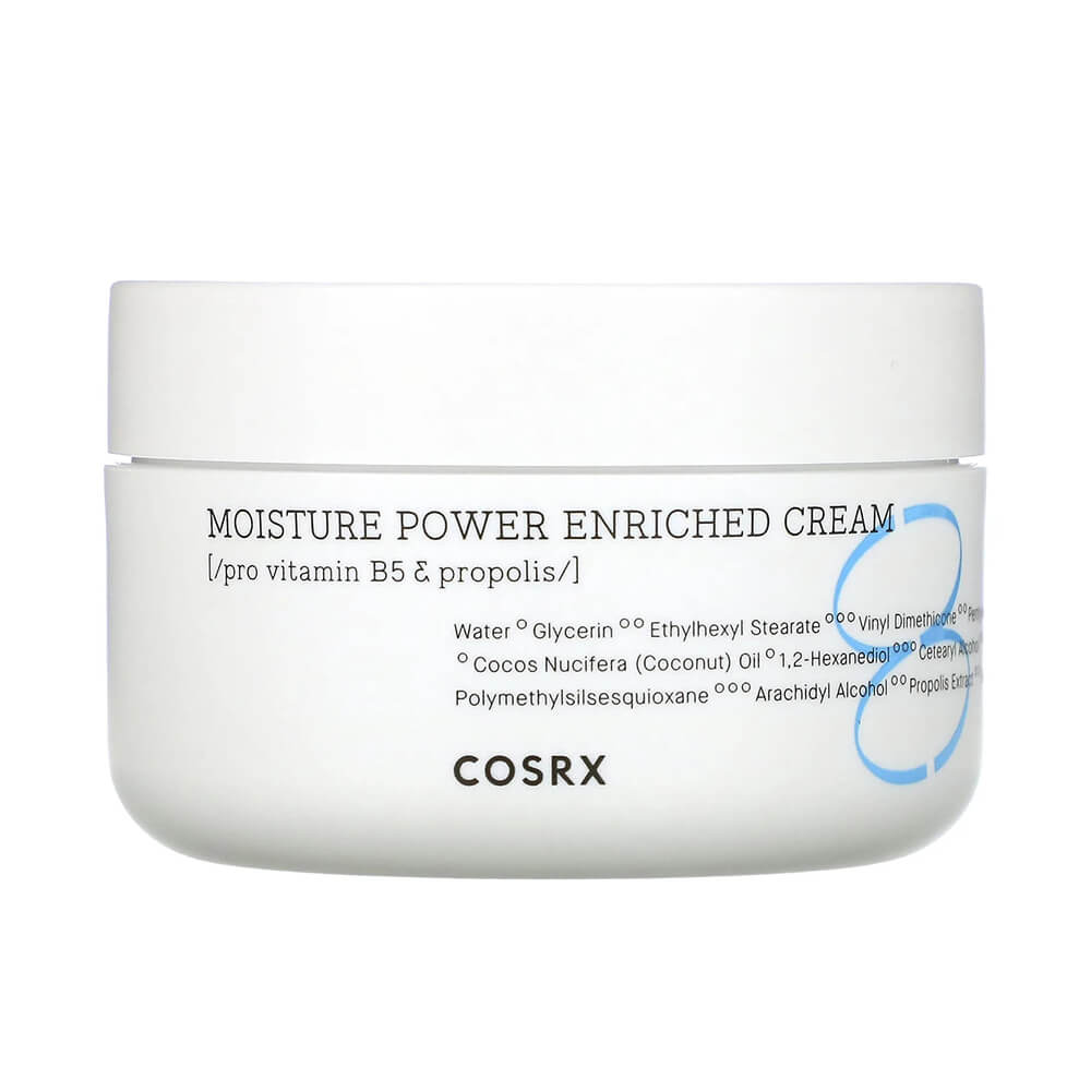 Восстанавливающий крем для глубокого увлажнения кожи COSRX Moisture Power Enriched Cream с церамидами, прополисом и пантенолом. Средство интенсивно питает, устраняет сухость и шелушение, укрепляет липидный барьер и восстанавливает повреждённую поверхность эпидермиса. Рекомендуется для сухой и обезвоженной кожи.
