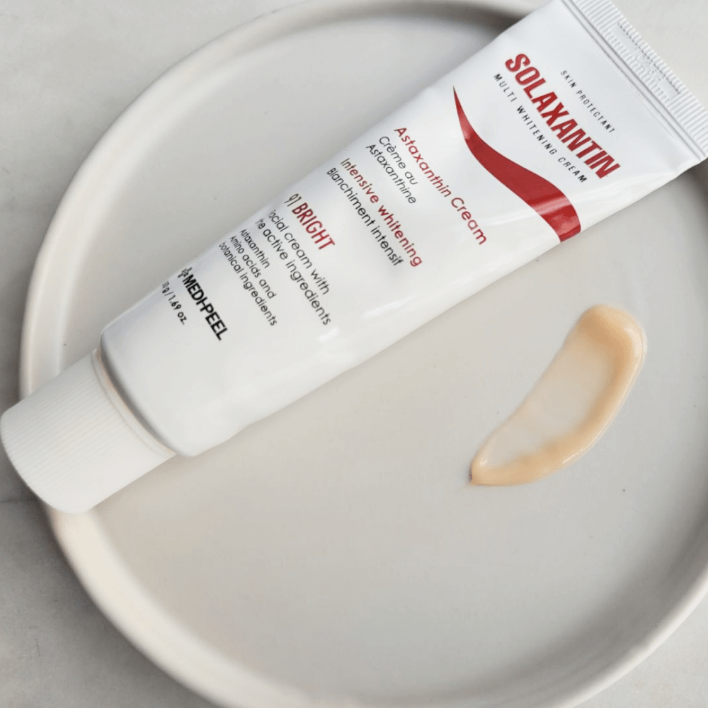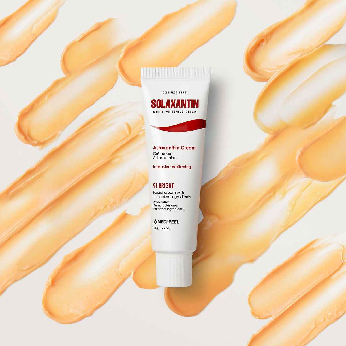 Антиоксидантный крем против пигментации Medi-Peel Solaxantin Multi Whitening Cream эффективно восстанавливает после воздействия ультрафиолета и свободных радикалов, препятствует разрушению коллагеновых волокон и появлению морщин. Осветляет нежелательную пигментацию, выравнивает тон и придаёт ровное здоровое сияние. Содержит астаксантин, комплекс пептидов и транексамовую кислоту.